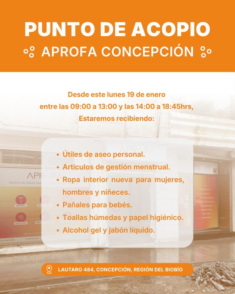Por lo mismo, desde este lunes 19 de enero mantienen dos puntos de acopio habilitados en Santiago y Concepción, en Lautaro 484, donde estarán recibiendo útiles de aseo personal, artículos de gestión menstrual, ropa interior y pañales entre otros elementos, de 09.00 a 13.00 y de 14.00 a 18.45 horas.